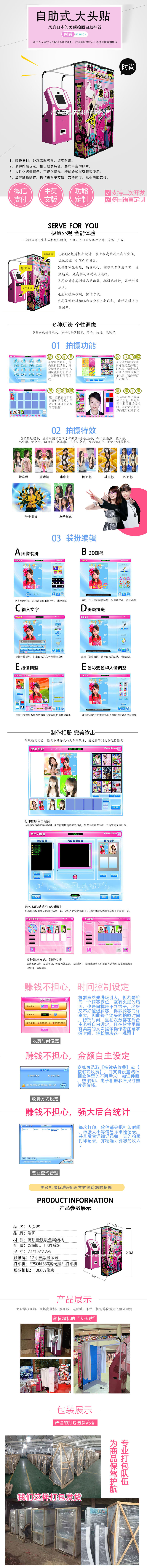 產品特點:大頭貼自助拍照機是廣州浩田數碼科技精心打造的自助照片拍攝打印一體機,用戶可選擇自己喜歡的模板設置、背景、文字、圖案等,加上自己喜歡的素材,讓出來的照片美輪美奐。