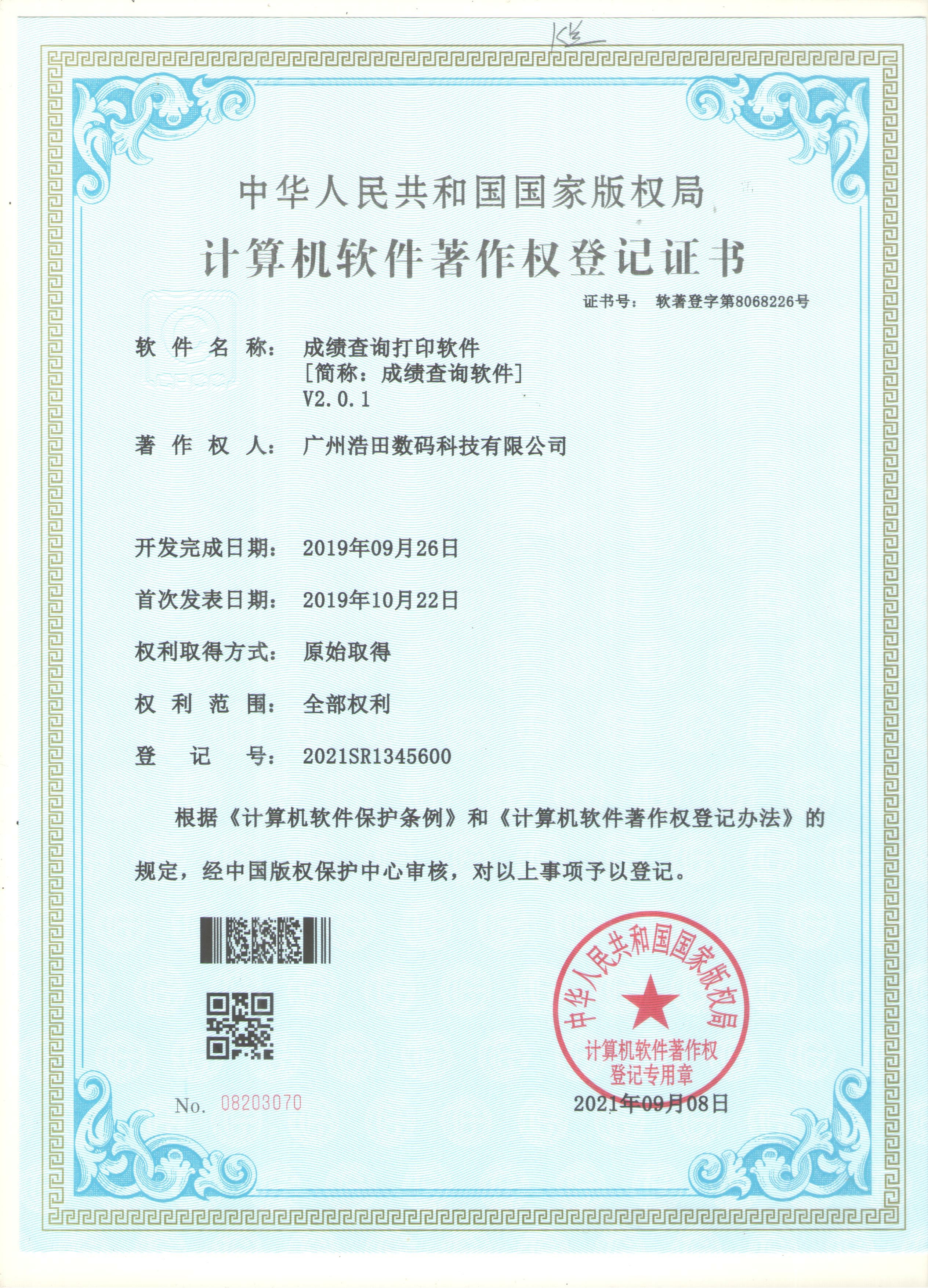 成績查詢打印軟件著作證